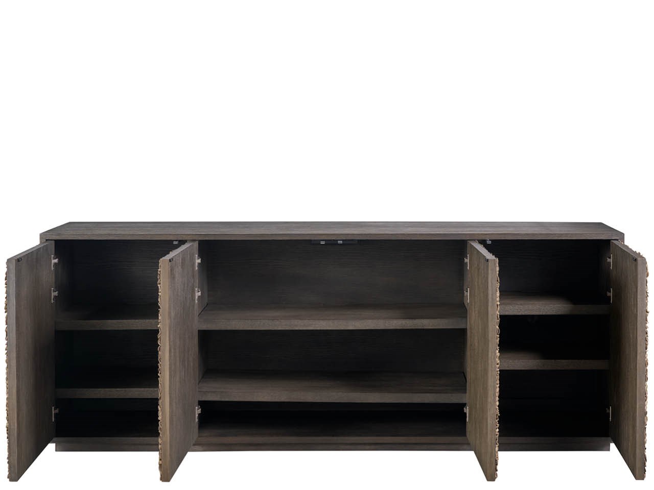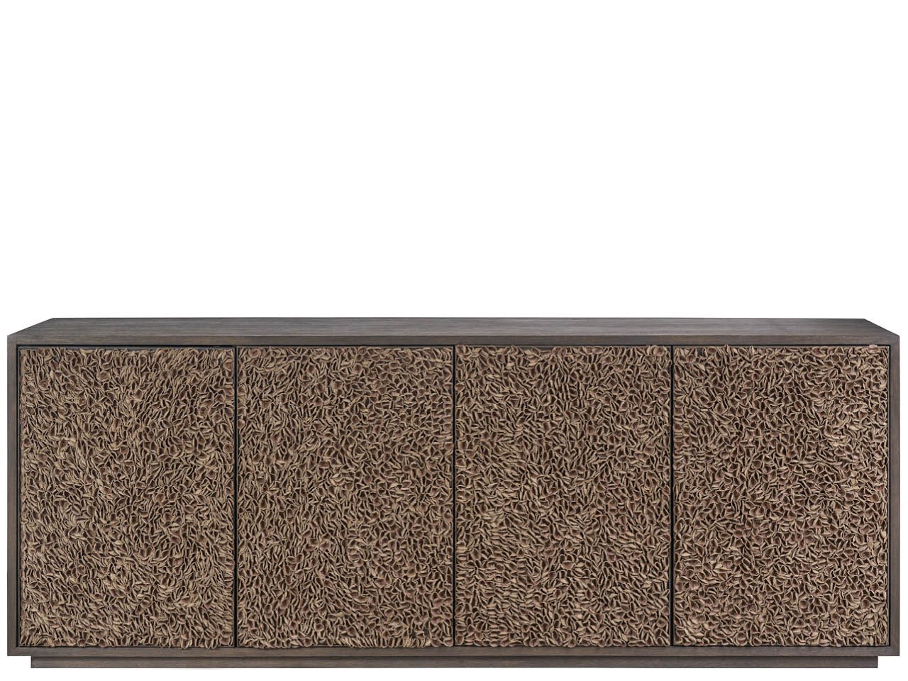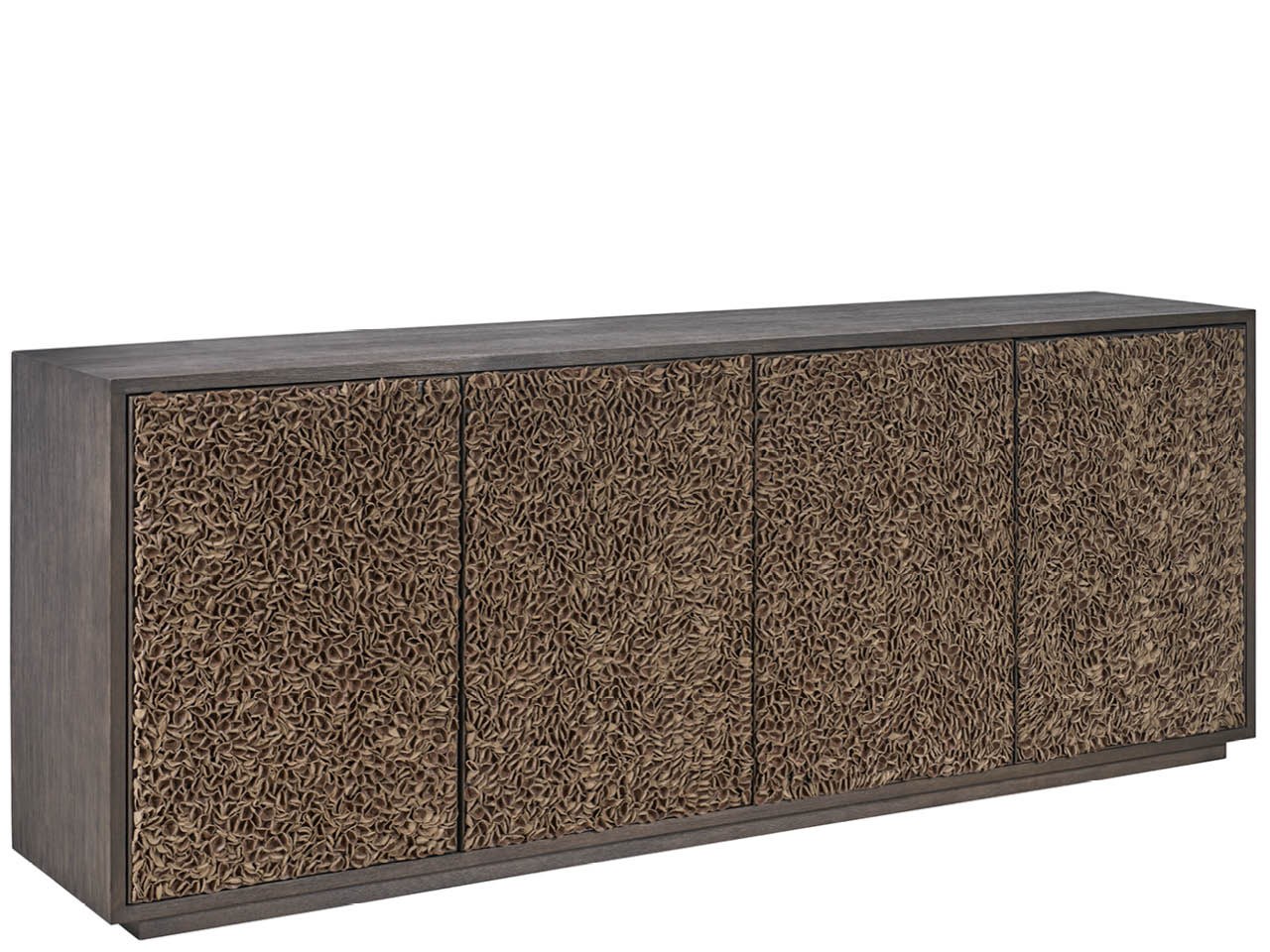 The Blossom Credenza in Dark Oak is an expansive cabinet featuring four doors overlaid with decorative Brown Leather Petals. This piece includes extensive wire management and a power bar, fusing artistic detail with high functionality.