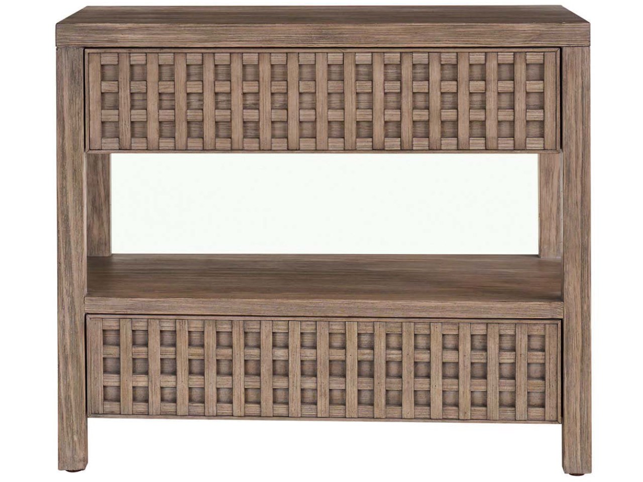 Dwell Boulder Nightstand (U462356)The Boulder Nightstand showcases the collection's architectural inspiration with its distinct latticework detailing, finished in a warm Boulder medium-brown. This piece offers both open and drawer storage, combining functionality with a touch of sophisticated design. Its unique texture and clean lines bring a refined, yet natural aesthetic to your bedside.DwellNightstandsBedroomU462356