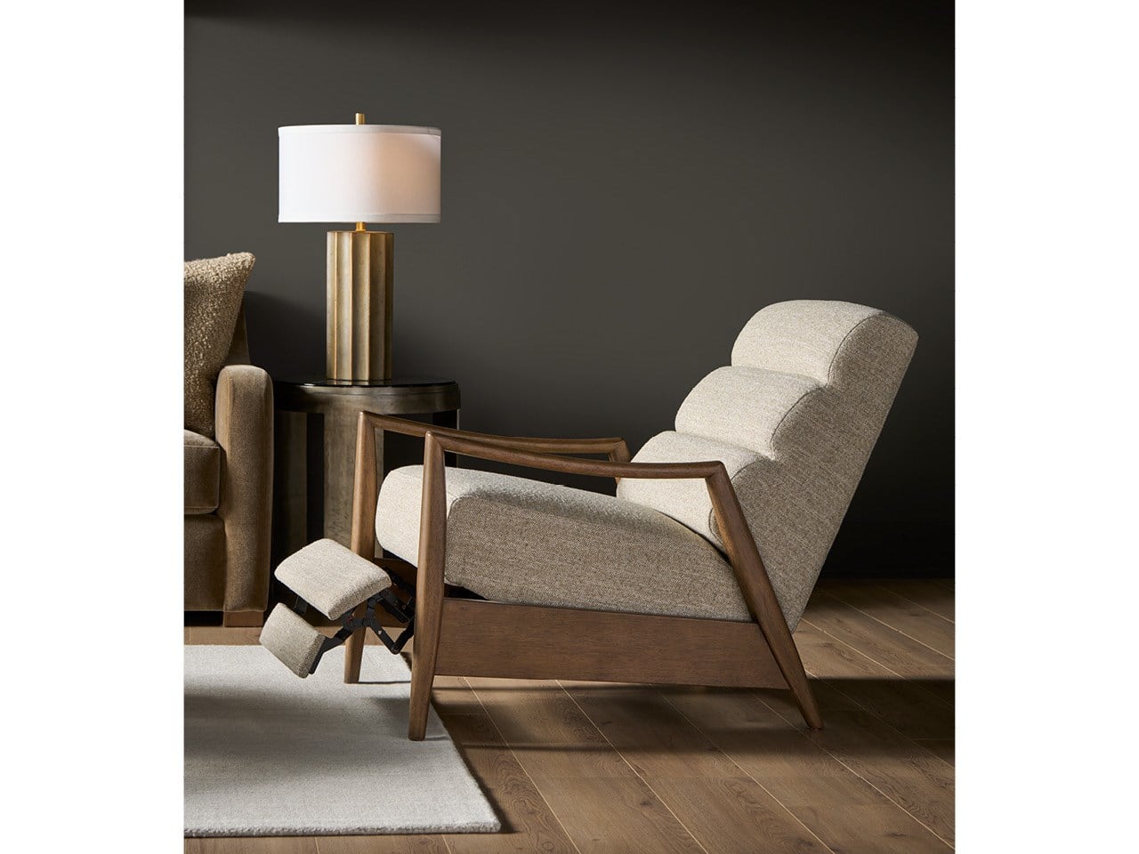 The versatile Lucca Recliner maintains the collection's tailored, modern aesthetic while integrating a sophisticated recline function for quiet relaxation. The chair offers a structured yet cozy experience, with its supportive tight foam cushion core ensuring excellent comfort in both upright and reclined positions.