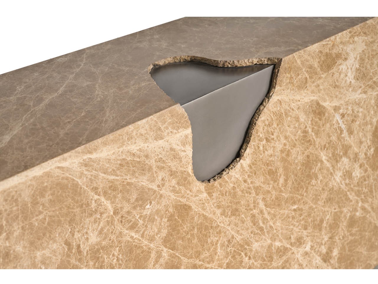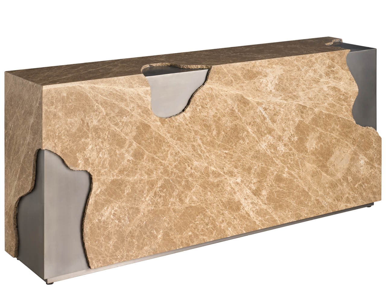 The Mirage Console Table is a long, linear piece featuring an elegant Light Emperador stone top. The stone rests within a slim frame clad in an Antique Nickel metal finish, making it a sophisticated architectural statement.