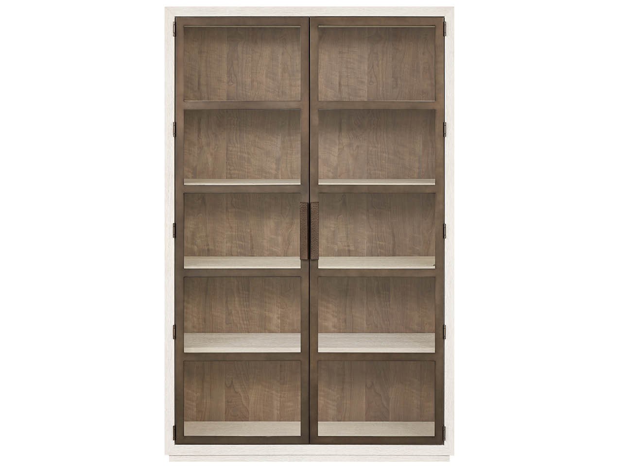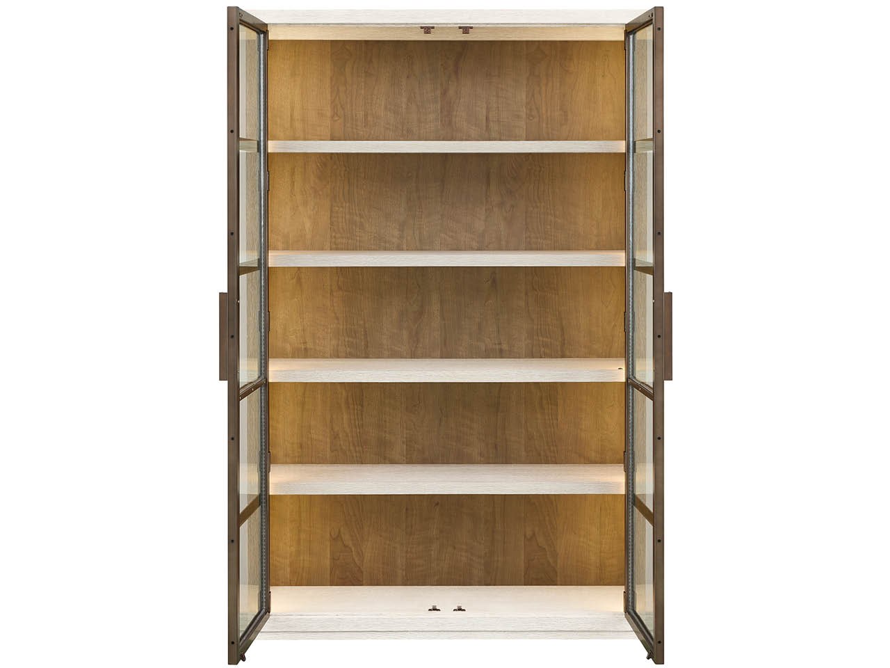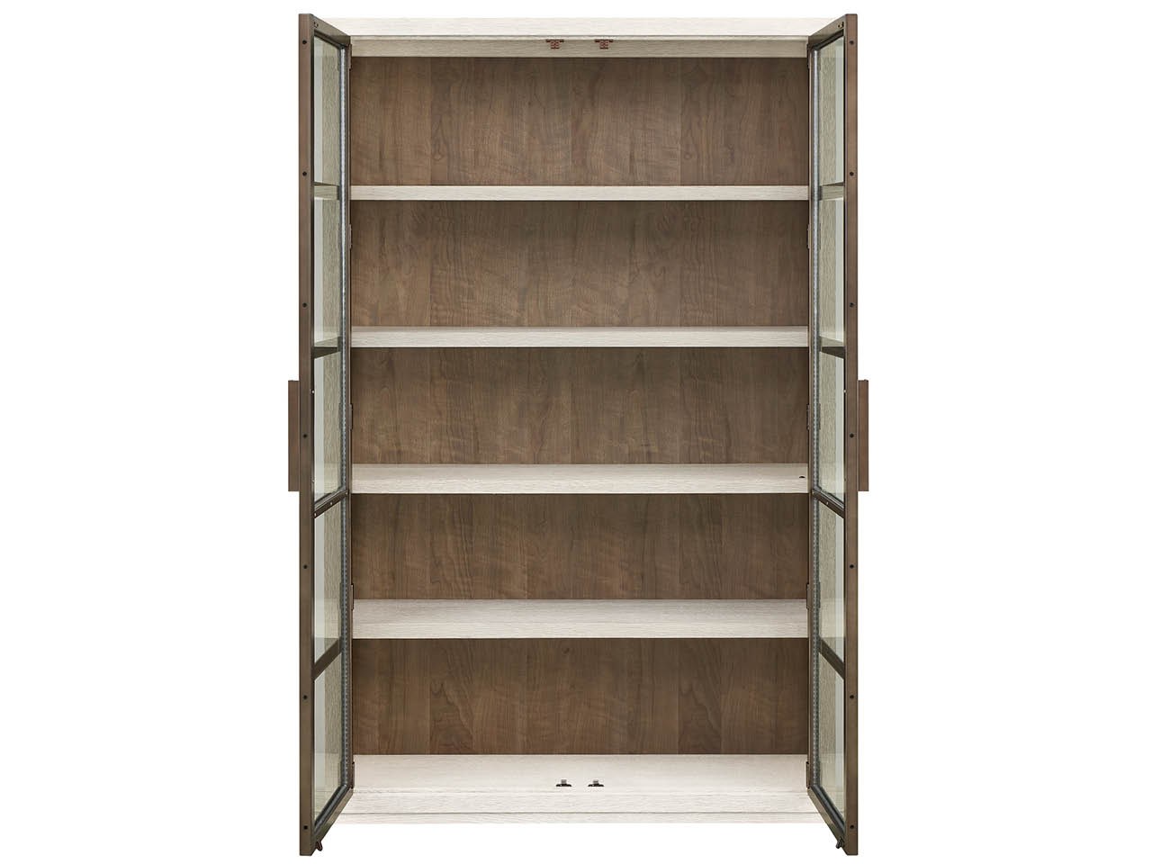 The Mist Display Cabinet is a tall, elegant showcase piece finished in light Mist Oak with subtle Smoked Gold metal accents. Its contrasting figured Haze Walnut back panel provides a rich, warm backdrop for highlighting displayed objects.