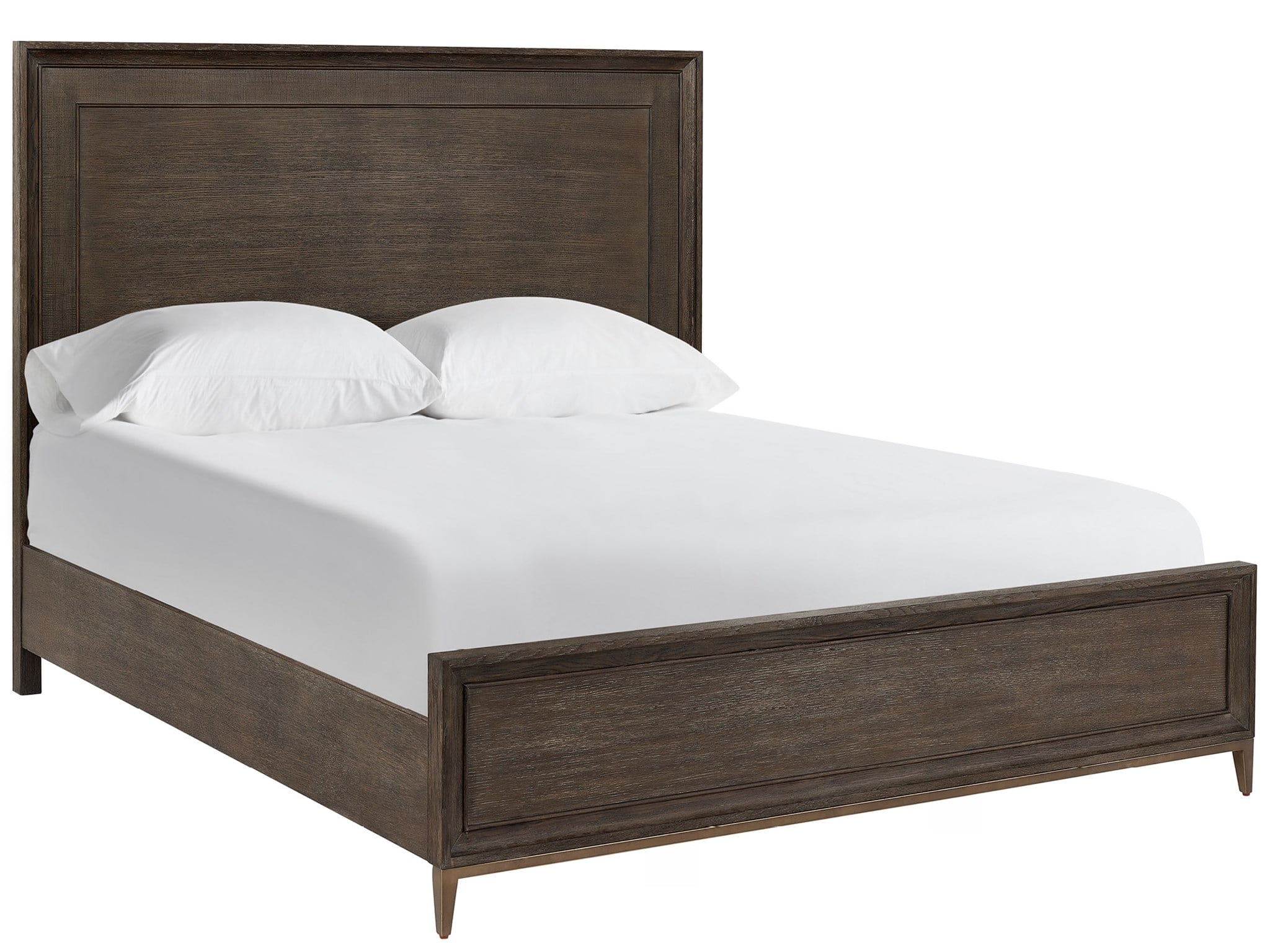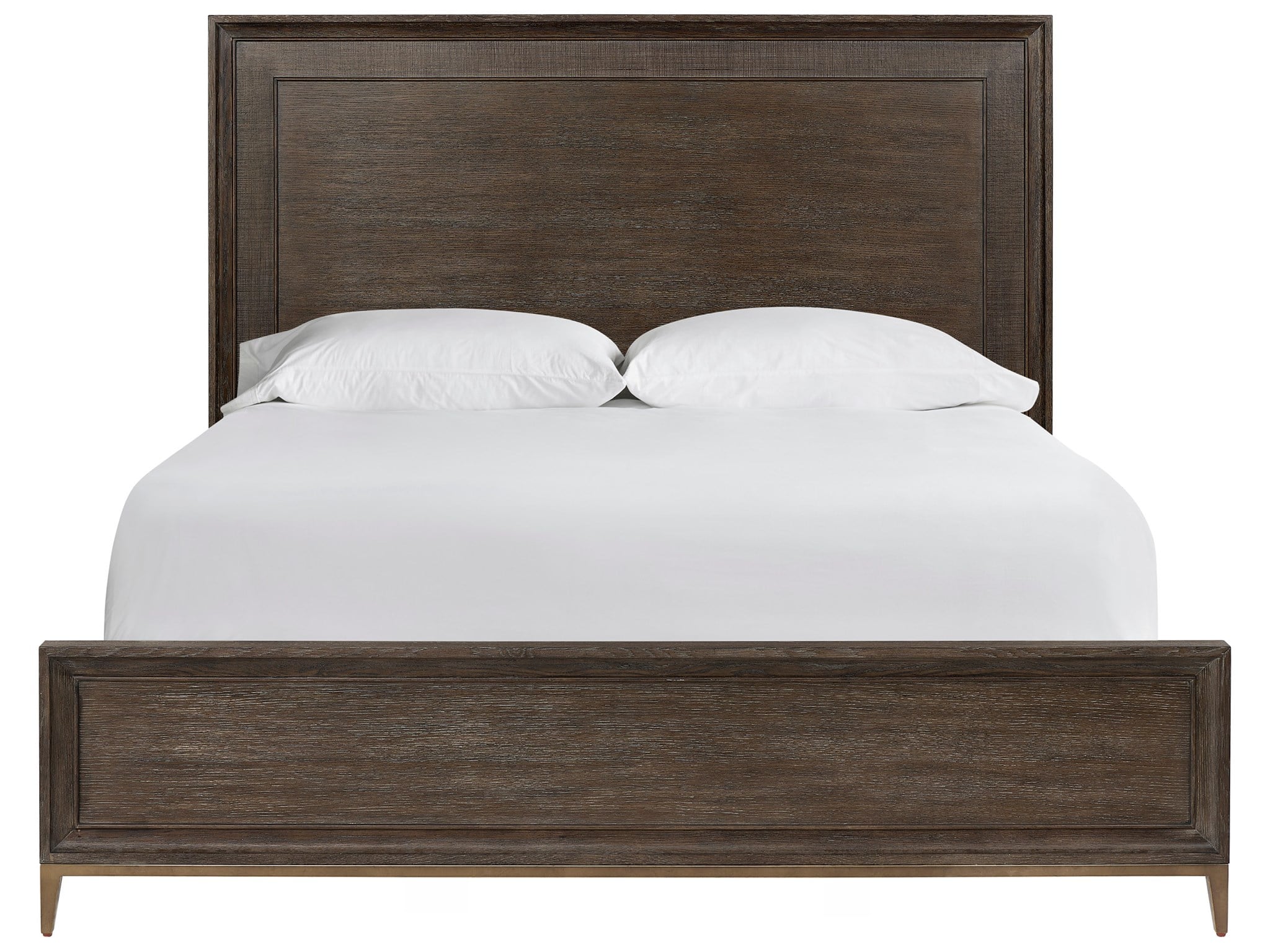 The Montclair Panel Bed offers a contemporary interpretation of traditional panel construction with an innovative inset band in Embossed Cocoa finish. Rich Cocoa framing provides elegant contrast while the metal footboard support with tapered legs adds sophisticated modern appeal.