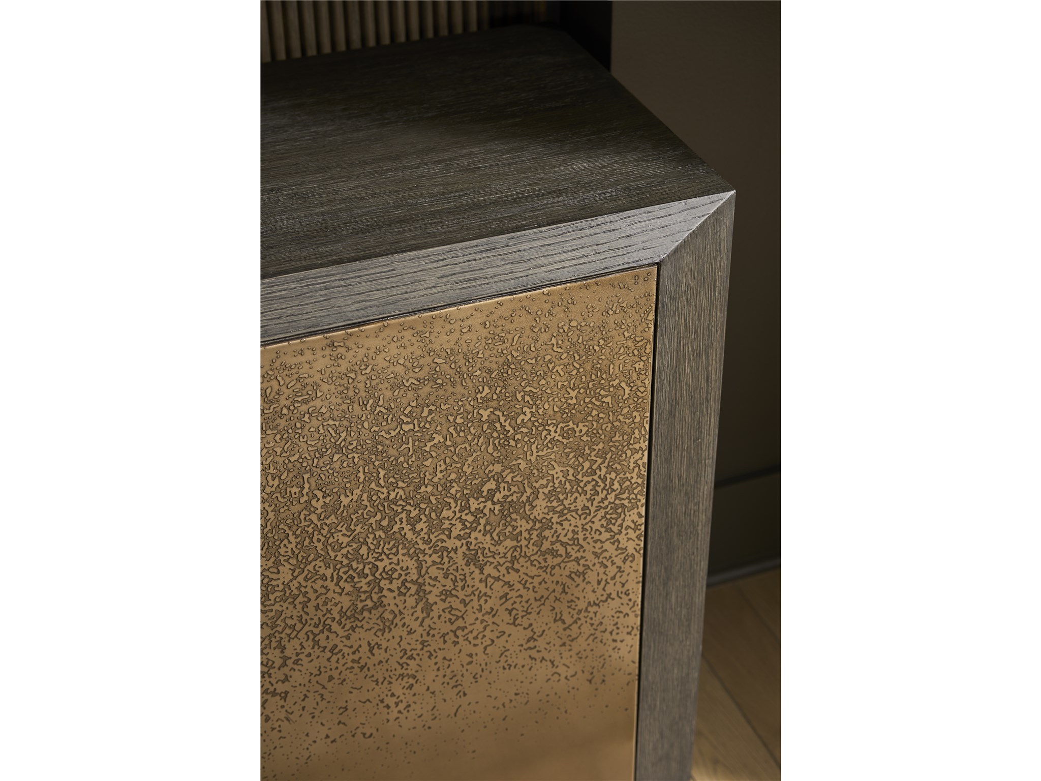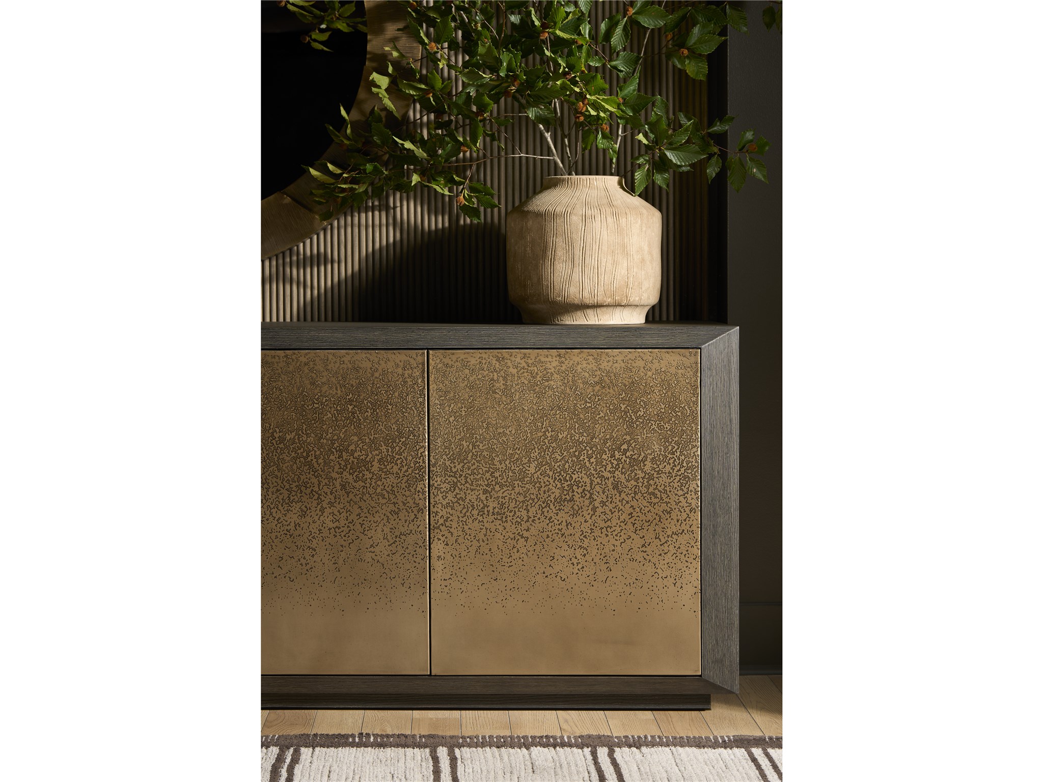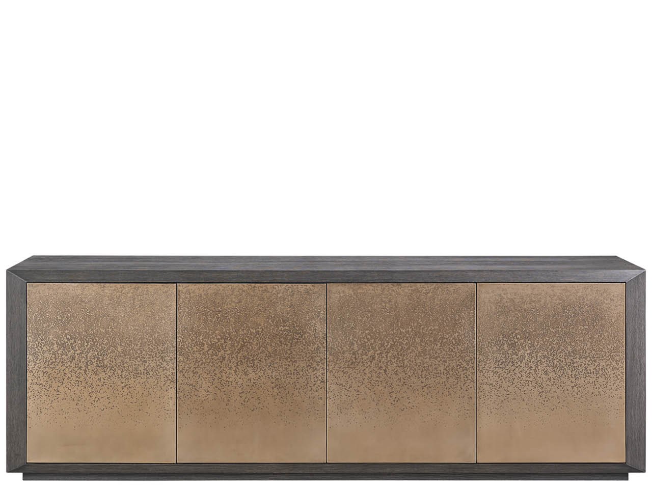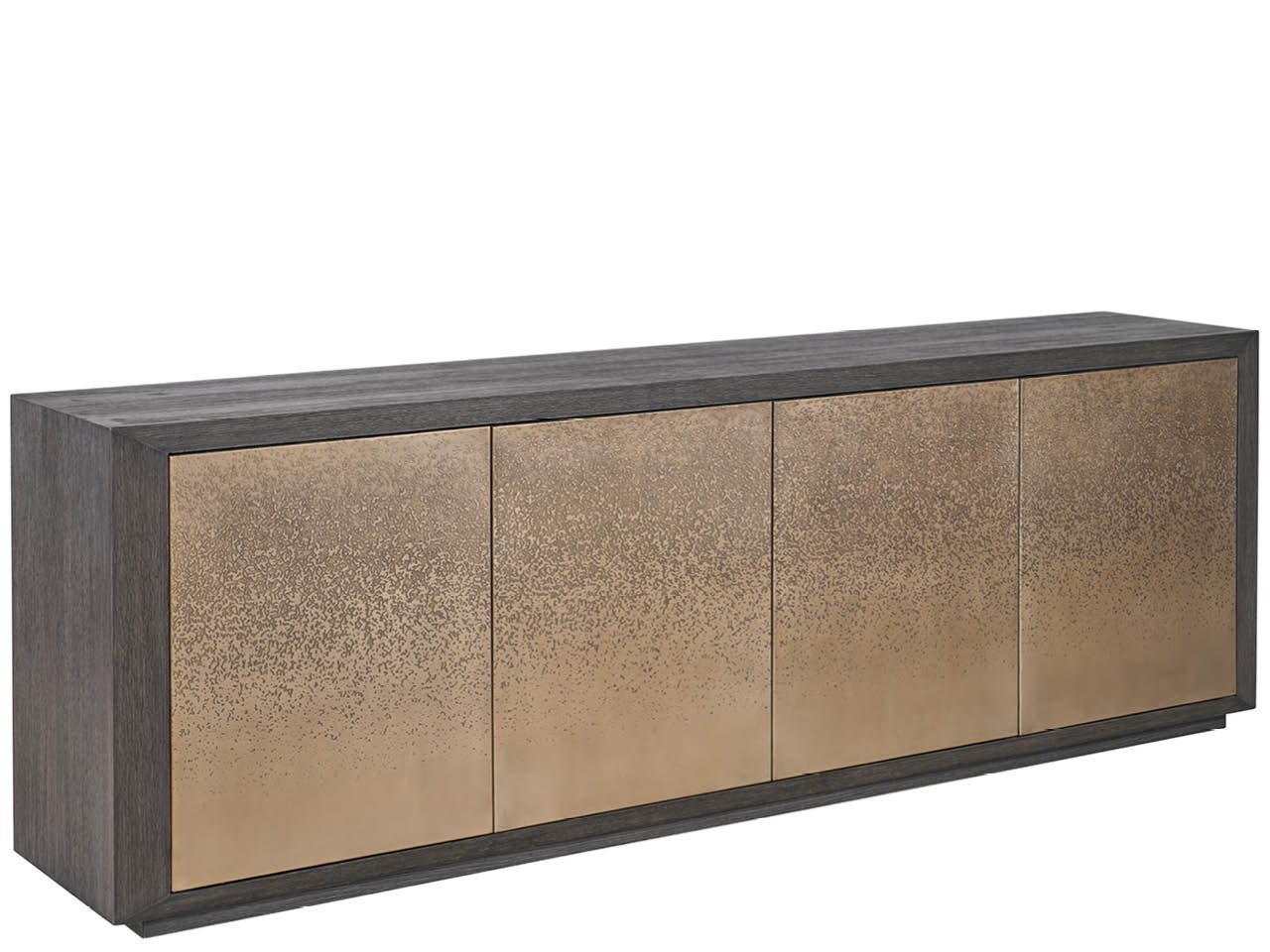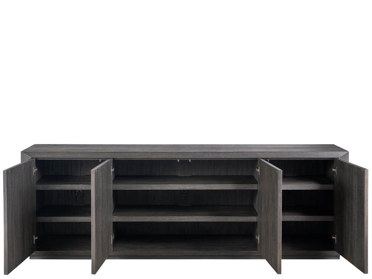 The expansive Nova Credenza is defined by its artistic, acid-etched door fronts that create a dramatic and continuous linear pattern across the case. Finished in rich Dark Oak, this piece provides an exceptional balance of powerful presence and elegant storage for media or dining essentials.